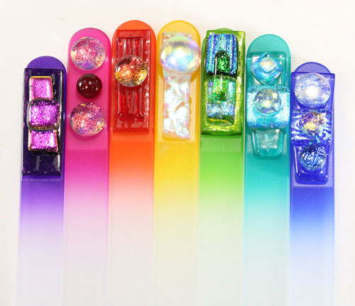 Purple, Magenta, Orange, Yellow, Green, Turquoise, Blue and Black (not shown) These make great gifts or stocking stuffers. Tempered Czech glass result in these files being extremely durable. We add our glass art piece to create a unique functional object d’art. This 3.5″ size is perfect for your purse.