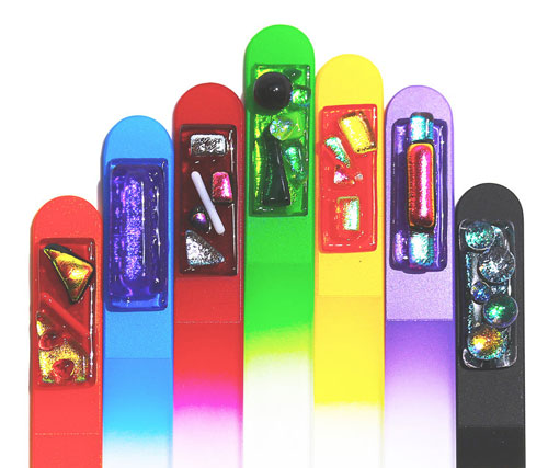 Black, Blue, Green, Orange, Pink, Purple, Turquoise (not shown) and Yellow. These make great gifts or stocking stuffers. Tempered Czech glass result in these files being extremely durable. We add our glass art piece to create a unique functional object d’art. They come with a protective cover for your purse or home. Choose by number, starting at the left (1-7)