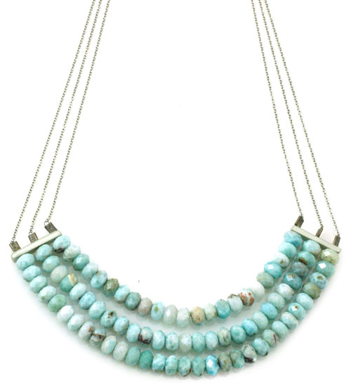 Sterling silver, 16” chain with 2” extender. Pendant is approx 3” wide. The variation of blue in these stones gives this Triple Larimar Necklace a rustic look. The chain is black.