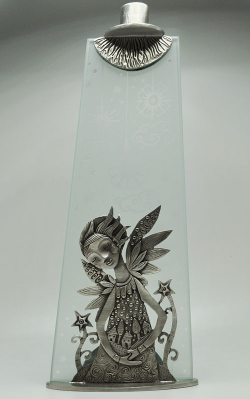 This Angel Candlestick is heavenly – with snowflakes etched into the glass and the beautiful angel cradling a little neighborhood in her arms. The etched glassware is masked with graphic images designed by Leandra Drumm specifically for that piece or shape and sandblasted to achieve the desired effect. She uses blown or pre – formed glassware and does all designing, masking, and etching in her studio in Akron. Dimensions: 13″x5″x3″
