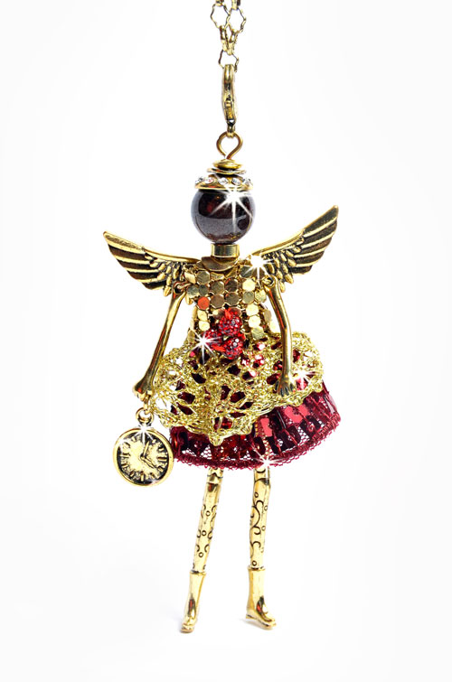 Each piece of jewellery is hand crafted with unique gemstones such as pearls, abalone shell, SWAROVSKI ZIRCONIA, garnets, cubic zirconia, hematite and cut crystals. This one has a brass chain and findings, red crystals at the waist, with a clock dangling from her hand. Her dress is red sequins and this one is great for January birthdays. It comes with a key chain that you can attach her to by removing her from the necklace and reattaching to the keychain.