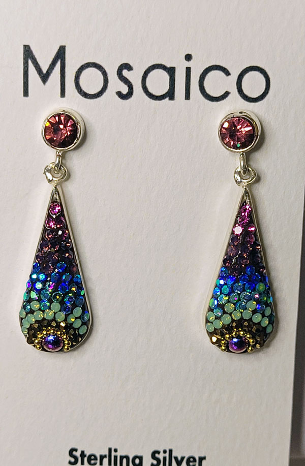 We have this shape on wires, but this one is on a post. The colors of the Austrian crystals are Jewel-tone colors. Very vibrant. Length: 1.25″