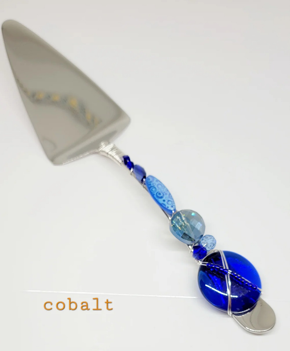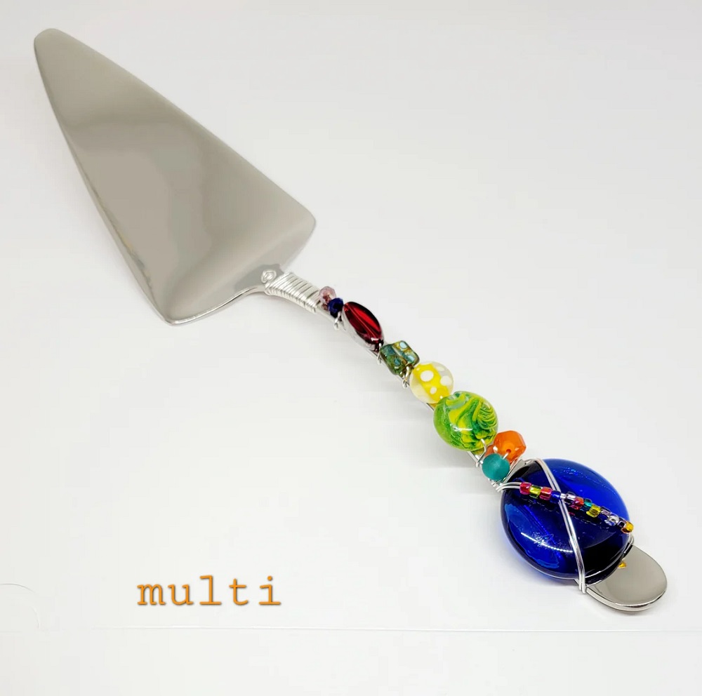 This beaded cake/pie server is the perfect hostess gift. Colors shown in the picture will vary, as there are no 2 alike. Made of 18/10 grade stainless steel and adorned with glass and genuine stone beads which are attached with non-tarnish wire. Due to the nature of the materials and how the beads are attached, it is best to only hand wash your servers. We have these in 2 colors – multi and cobalt.