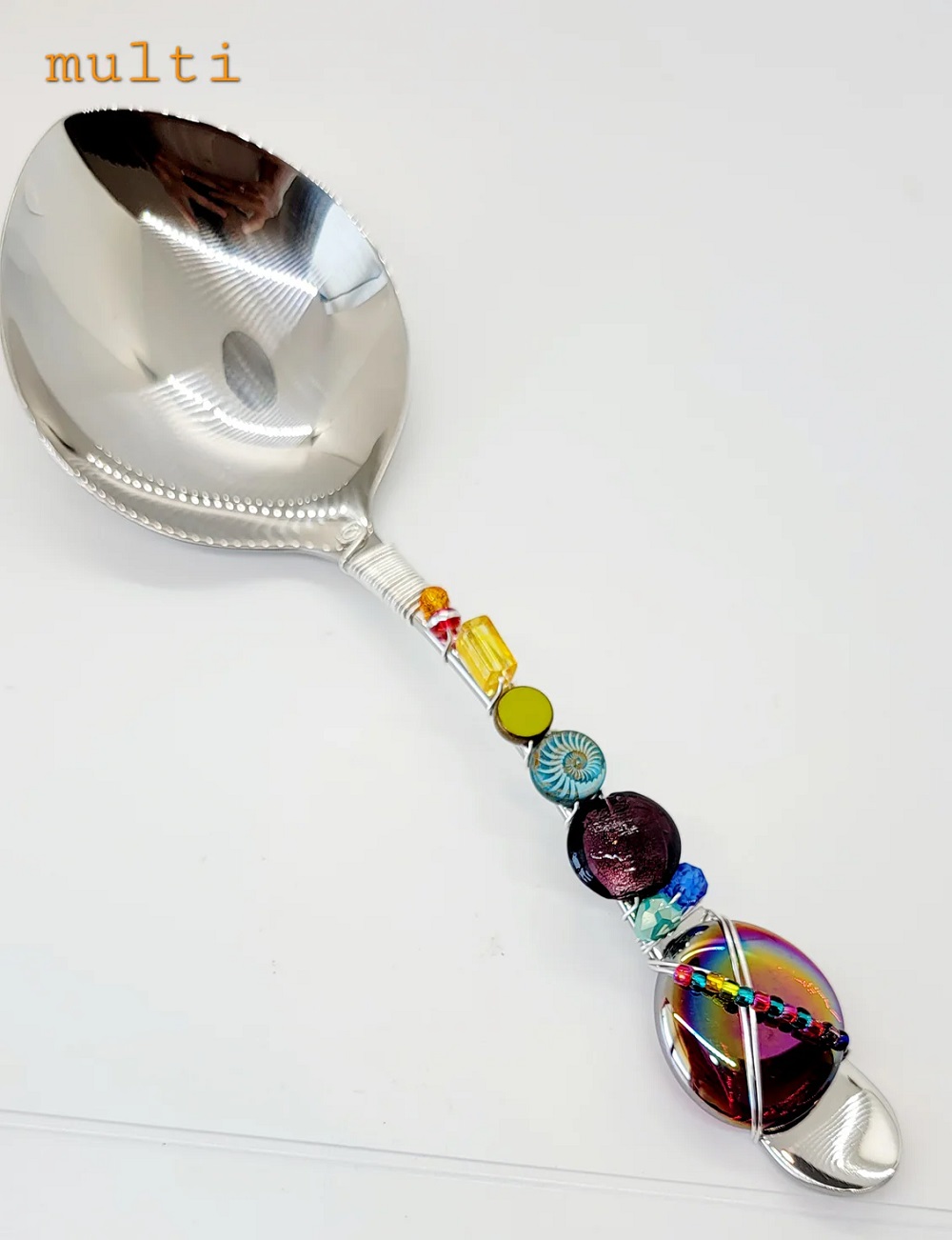 Aren’t we always looking for a decent spoon to serve casseroles? This beaded Casserole Spoon is ideal. We carry it in two colors – Amber and Multi. No 2 spoons are alike so picture will depict general color combo, but beads will vary. Made of 18/10 grade stainless steel and adorned with glass and genuine stone beads which are attached with non-tarnish wire. Due to the nature of the materials and how the beads are attached, it is best to only hand wash your servers.