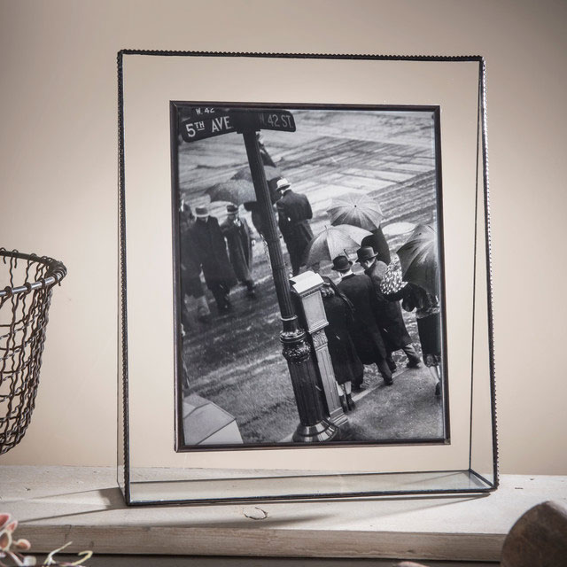 Looks vintage – with the clear glass surrounded by a beaded metal edge. Picture almost looks suspended in the middle. It is Vertical.