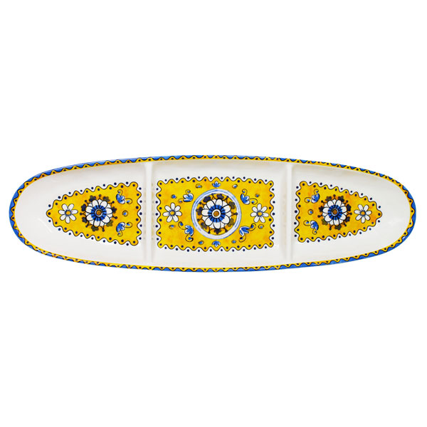 Beautifully crafted 100% Melamine 16″ three section serving tray offers exceptional weight and a textured surface that gives it the appearance of real ceramic. BPA Free 100% melamine, shatter resistant and dishwasher safe, top and bottom rack, as with all melamine, not recommended for microwave. Product includes 1 x Sectioned Oval Tray with dimensions of 16″ by 4.5″.