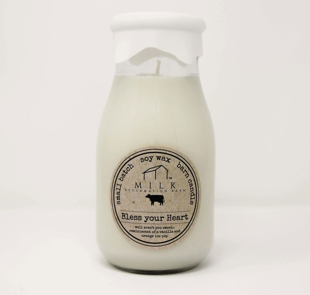 This is a new scent for us and so we are separating it from older inventory. It is reminiscent of a vanilla and orange ice pop. We have repurposed the classic Milk bottle into a beautiful soy candle. The Milk Bottle Candle contains 100 percent American grown soy wax and a lead free all cotton wick. Available in all of our classic Farmhouse scents. Each scent specifically blended to evoke a memory of living here on the farm. Each candle contains 13 ounces of wax and produces a burn time of approximately 100 hours.