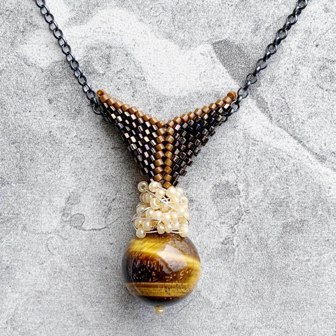 This pendant necklace features an intricate beadwork bail and Czech glass seed beads wire wrapped on Sterling, accenting the beautiful gemstone bead focal. Oxidized Sterling Silver rolo chain. Lobster clasp closure.
