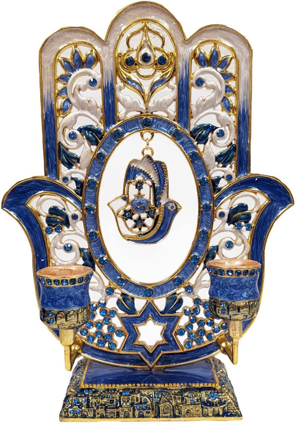 Blue Hamsa Candle Holder/ 9 1/4″ H, 7″ L / . Hand painted Enamel with crystals. Comes in a gift box