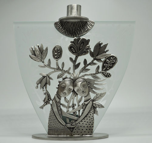 This gorgeous etched glass-pewter candlestick is ideal for a wedding or anniversary. Leandra is known for etched bowls decorated with words and charming figures spinning tales from top to bottom, as well as wine glasses, mugs, platters and all manner of vessels. Her fanciful pewter switchplates, wall sculptures, drawer pulls, ornaments, measuring spoons and utensils illustrate her wonderful world of stars, whirligigs and skyrockets. Dimensions: 9″x8″x2.5″