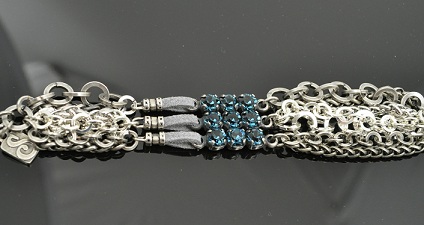 From the Sea Collection by Israeli artist Smadar Eliasaf, comes this amazing multi chain, multi link bracelet, with grey leather and midnight blue crystals. Absolutely gorgeous!