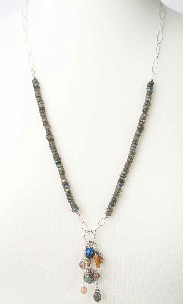 This necklace features strands of labradorite with a tassel focal including peach moonstone, czech glass, fine silver and more! Sterling silver chain and components complete this designer look.