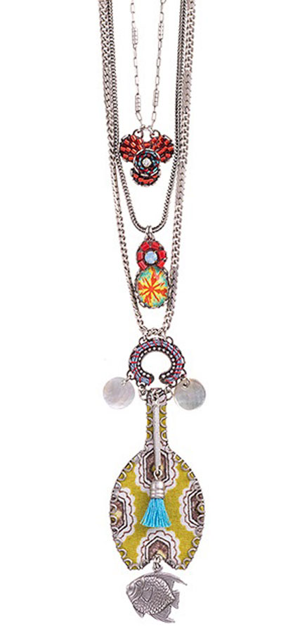 Our jewelry are 100% handcrafted by Ayala’s dedicated team. We ensure that every element that goes into our craft is nickel free, lead free and contains no hazardous materials. Ayala Bar Jewelry contains silver plated brass & metal alloys, glass beads, ceramic stones, crystal rhinestones, and / or fabrics. This triple tiered long necklace is so interesting, with all the findings, bangles and fabric.