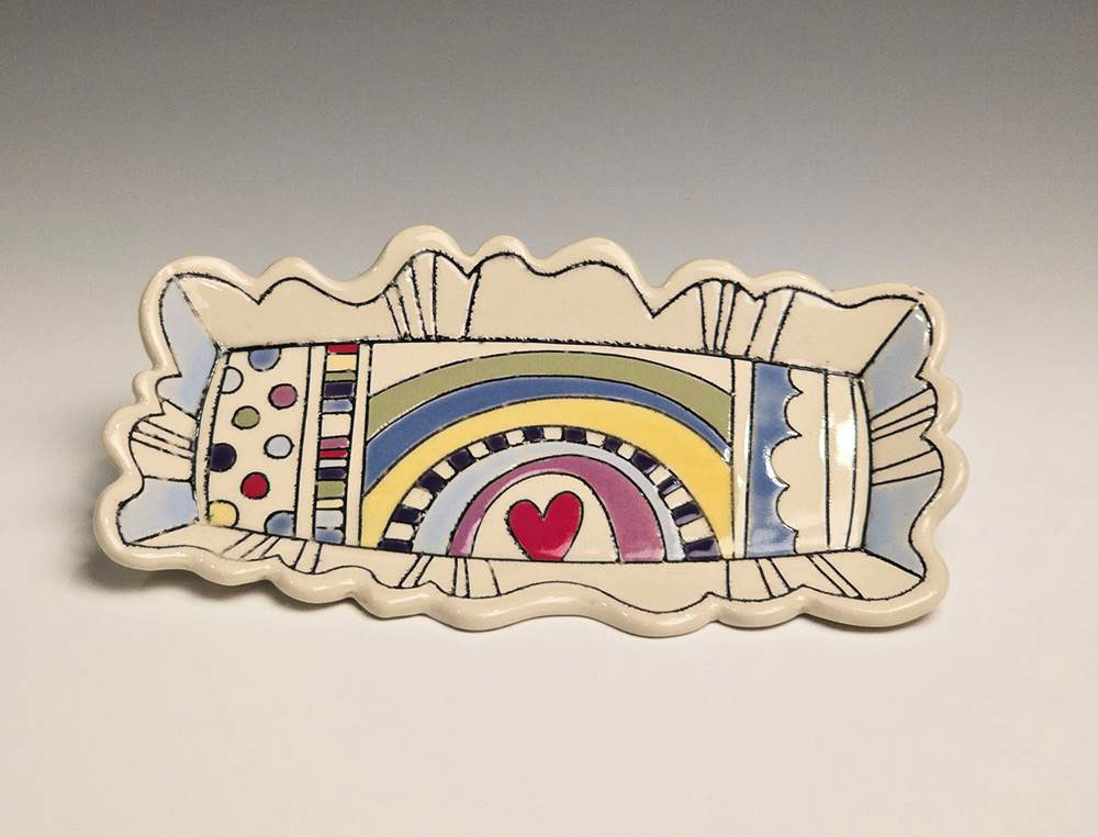 This small dish is made from porcelain mix clay with hand-carved and hand-painted designs. All pieces are unique and one-of-a-kind. It is 8″ in length, 4″ across and about 1″ high. The 2 designs we have are clouds and rainbow with heart.
