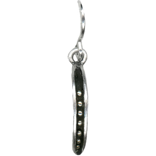 This is a hoop earring called Cher. If you look at it from the front, you see all the little silver dots encased like a rim of a tire. From the side, it’s just plain silver. The irregularity of the circle is so appealing.