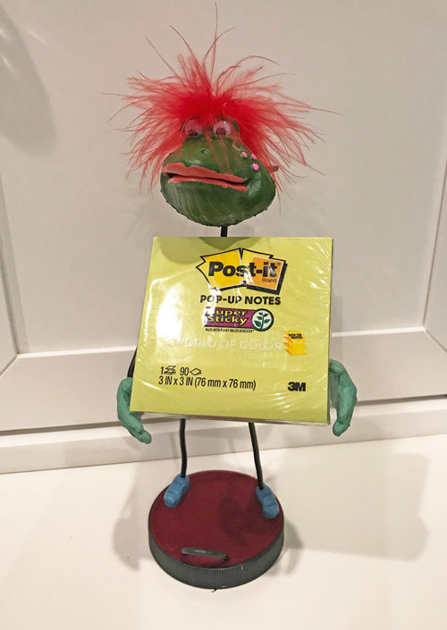 The Zortz heads have always demanded a body. I tried many different ideas over the years but they were all just to hard to produce. One day my brother-in-law gave me a spool of this really cool traffic light wire (he works for the MTA). After playing around with it for a while, running it through research and development, I came up with Pozers, a flexible funky full bodied Zortz, that can hold a cell phone in it’s loving arms or a notepad. Dimensions:3” X 3” X 10”