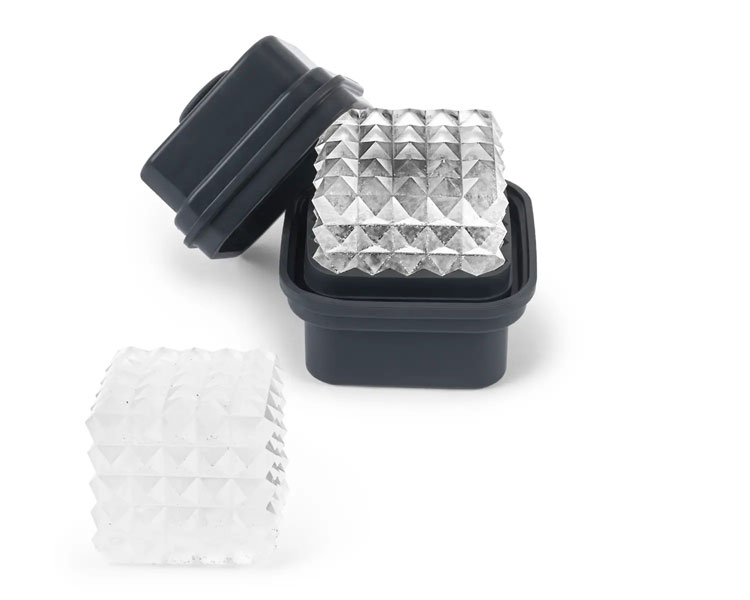 Our Prism Ice Mold makes an extra-large geometric cube that melts slowly and evenly, chilling drinks perfectly without diluting them. Look how gorgeous they look in the glass. Dimensions: 2.6″ l x 2.6″ w x 2.2″ h. Great Hostess Gift