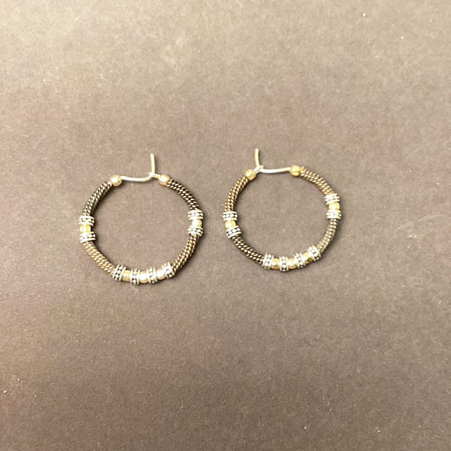 Three different metals make this hoop stand out. The wirewrap is the copper metal. Silver and Gold beads are scattered throughout. Diameter: 1.25″