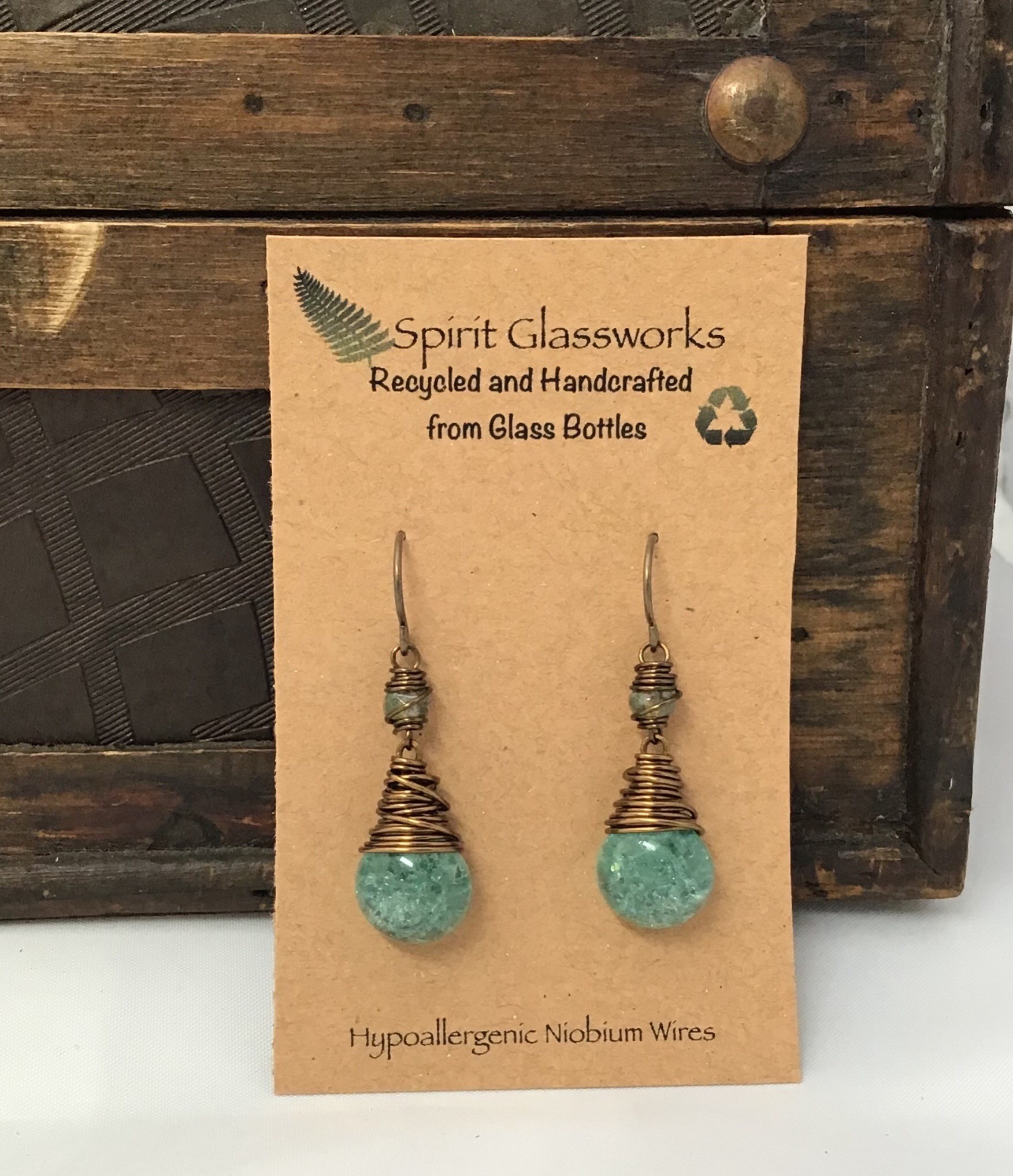 Recycled bottle glass melted into a drop with a crackle finsh. Wrapped in Antique Brass Wire. Made from a Scotch Bottle. Hypoallergenic Niobium wires.