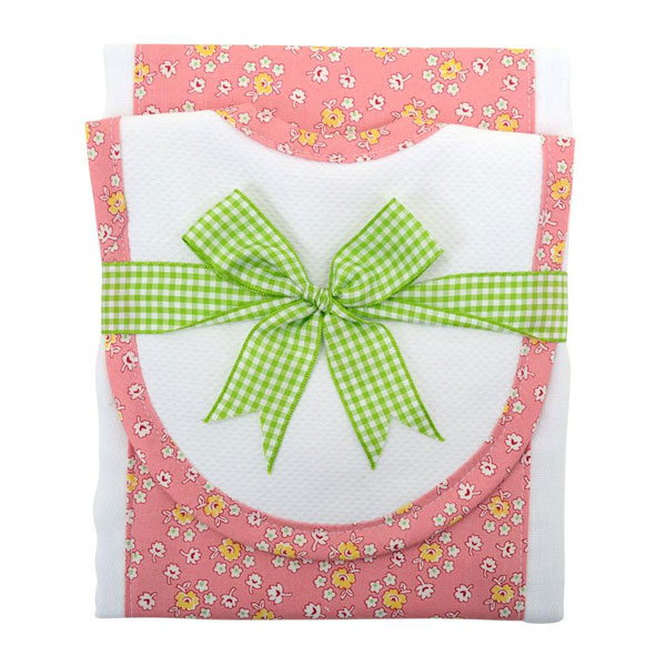 The popular newborn feeding set features a super absorbent burp cloth with a fabric panel sewn down the middle and a small bib backed with 100% cotton terry. This extra thick bib is the perfect size for little droolers and early feedings. This set comes tied with a gorgeous grosgrain bow; ready for gifting!