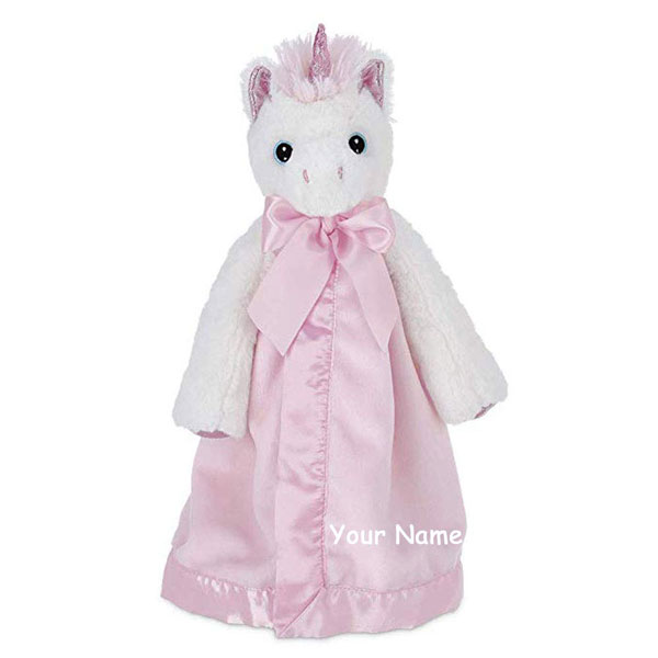 This Dreamer Unicorn Snuggler is a perfect gift for the little baby girl. It is an adorable plush mini blanket with a Unicorn head at the top. Surround by pink satin trim, this little “blankee” provides soothing comfort to the little one. It measures 18×18″. The underside is soft satin and the eyes are totally infant safe. Personalization is offered. Message Terry to find out details.