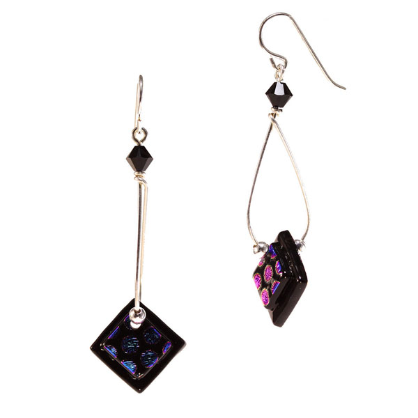This simple but elegant style features a looped sterling silver filled wire with a dichroic glass diamond shape at the bottom. A Swarovski crystal in matching color is at the top. Each earring has it’s own unique pattern incorporated in the diamond.