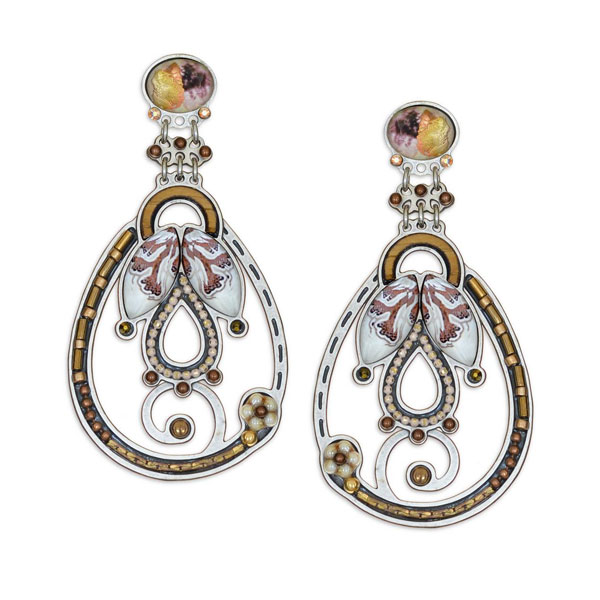 Another style out of the color group Dune, is this large teardrop-shaped earring suspended from a post. The Dune color group mixes the look of silver and gold with just a touch of purple in the marquis shaped elements. It also matches necklace YND-1935707. Length: 2.5″