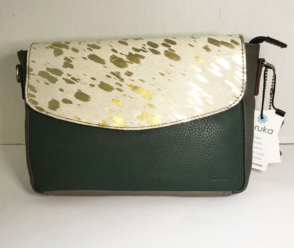 Animal print, Green, Brown and Tan recycled and handmade leather bag by Soruka. Zippered pocket inside with a crossbody strap. Size: 10×7.5×2.5″
