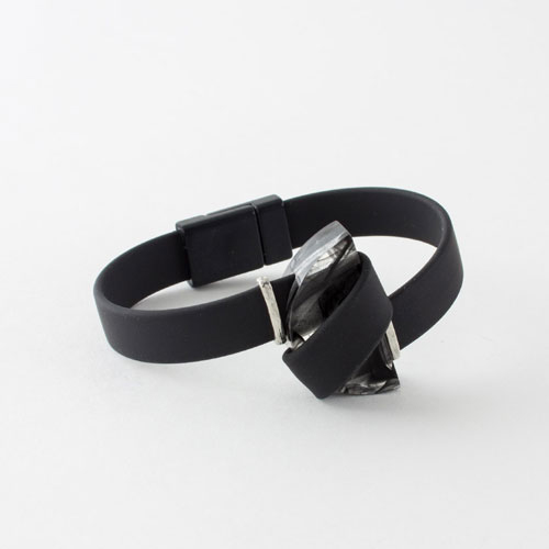A statement bracelet made from PVC, pewter, and resin, Euony was made for a women who dares to be seen. Here, a lush black ribbon wraps around an inky resin bead. Magnetic Clasp. 6.9″ in diameter