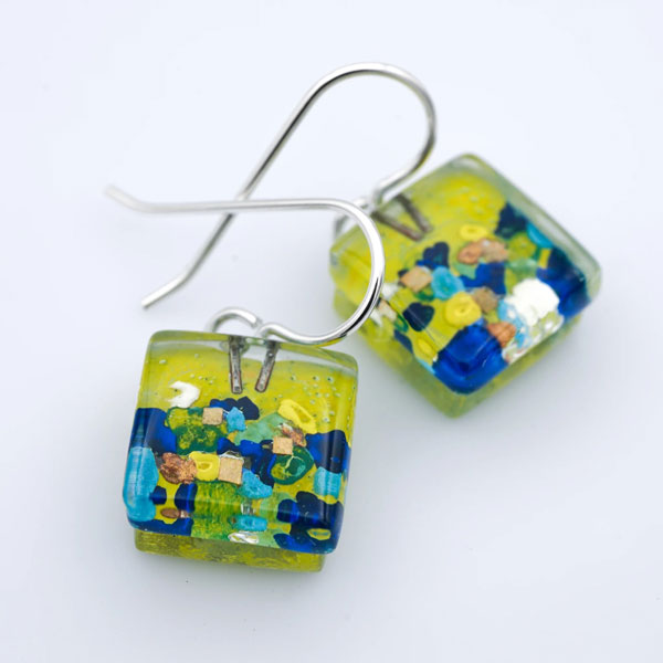 Garden is part of the VERDANT collection. The variety of colors (blues, whites, yellows, golds) makes it very wearable and easy to combine with a lot of what’s in your wardrobe. Its a very popular design that we’ve been making for years. Thick 4mm glass makes these small earrings feel more cubic than square. The ear wires are argentium silver (nickel-free, slow tarnish) and come with silicone ear backs included.