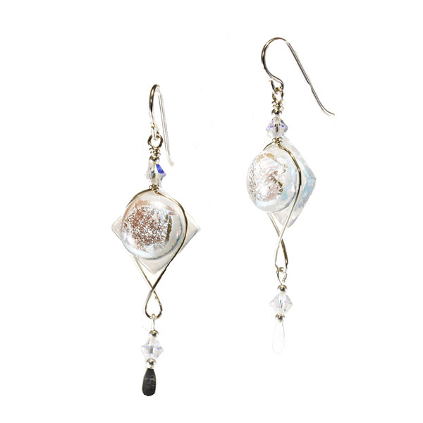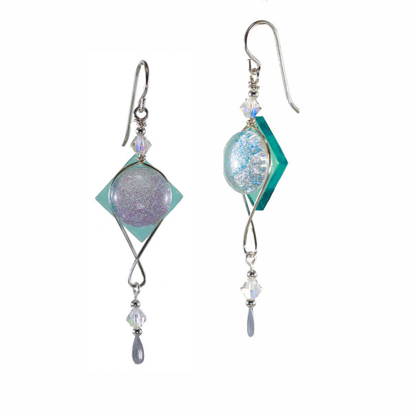 This geometric twist fused glass earring has several interesting elements – the glittery center is crystal on all. The color of the glass behind the center is what comes through. The wire underneath is twisted and then a drop of Swarovski crysal is suspended. We have 4 colors – 3 have sterling silver filled wire and the red one is gold filled wire.
