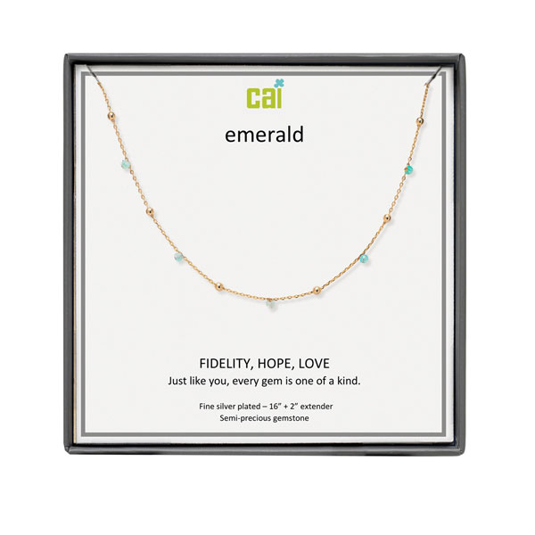 The semi-precious stone on this 14Kgold plated, 16″ necklace is Aquamarine (picture says Emerald, but it’s not). The stones are alternated with gold balls.