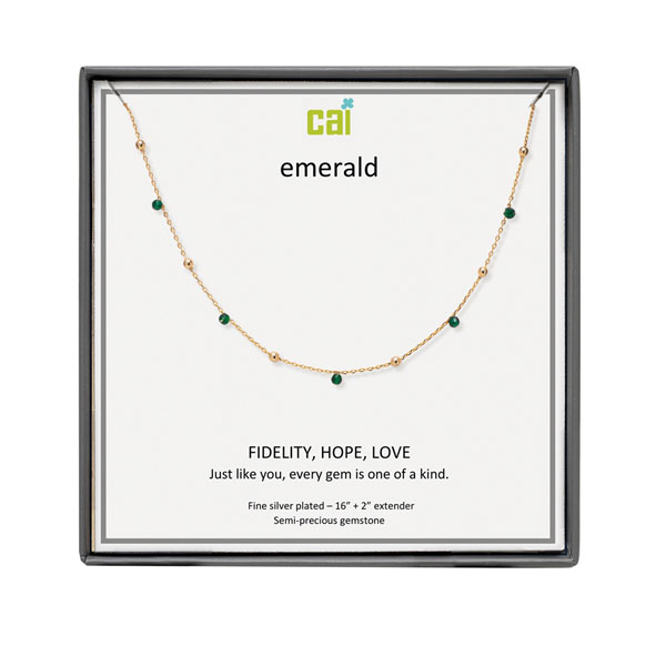 The gorgeous green of this semi-precious stone emerald, is alternated with 14k gold plated gold balls, on a 16″ chain with a 2″ extender.