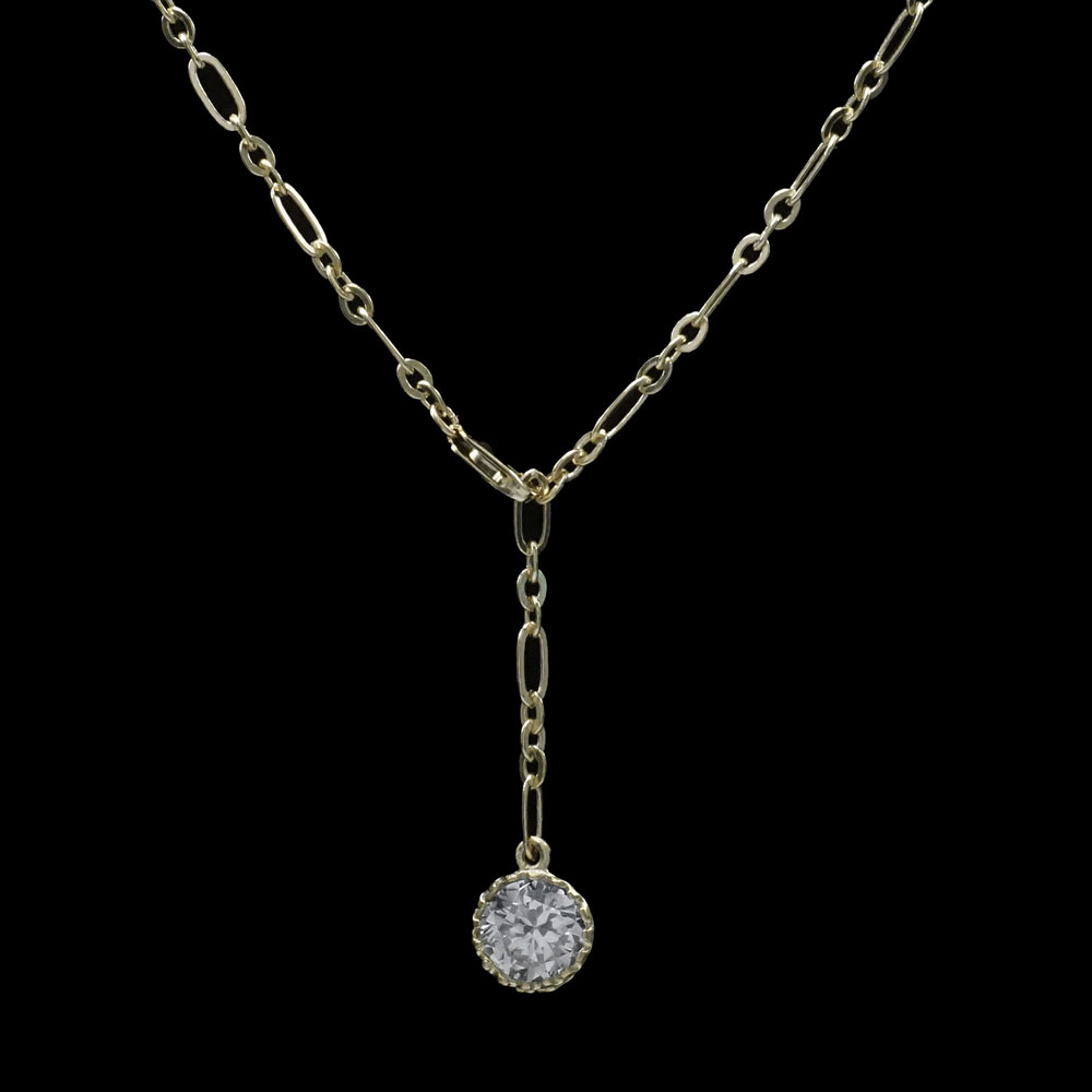 Gold link Y necklace with clear round stone with braided hand hammered edging. You can adjust the length of the Y, but it is set up to be a 14″ with a drop to 18″