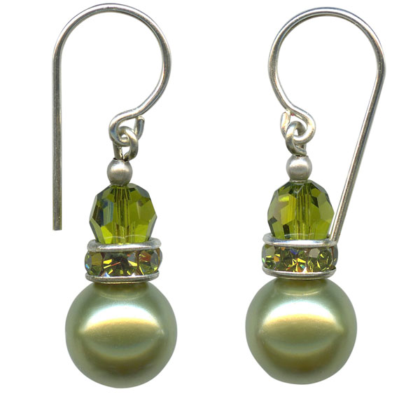 Green coated glass pearl drops. Olivine Austrian crystal and rhinestone accents. Bells 44 measure 3/4 inches in length. Ear wires are sterling silver. All handwork done in the USA.
