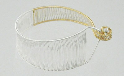 Margaret Aden views her work as gossamer threads of inter-connectivity in our post industrial world. Bracelet can be resized by rolling or unrolling the coiled wire at the clasp.