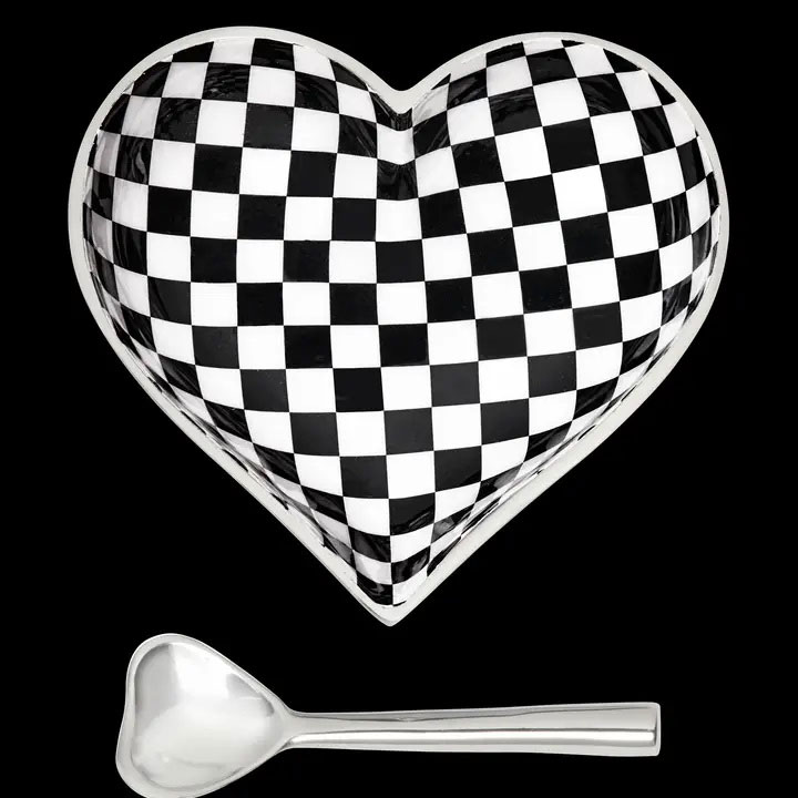 Happy Hearts make it easy to show someone your love! They’re available in everyone’s favorite colors and patterns! Fill ’em with yummy candies, nuts, snacks, crackers, chips and dips…or use them as colorful catchalls for jewelry and other small items. A shiny silver Heart Spoon comes with every dish. Happy Hearts nest perfectly with our smaller 4″ Tiny Hearts for double the love! Handcrafted of food-safe polished aluminum. Size: 5.25″; Spoon-4″