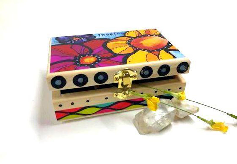 “These trinket boxes are selling like crazy for me at my art shows. The boxes are made from balsa wood, I use 4×6 reproductions of my original paintings and adhere them to the top and inside of the box with sealer. The edges are detail with washi tape and hand painted and metallic paints. Each one has a quote sticker in it. The washi tape, quotes and color of dots will vary as each one is a little different, unique and one of a kind. ”