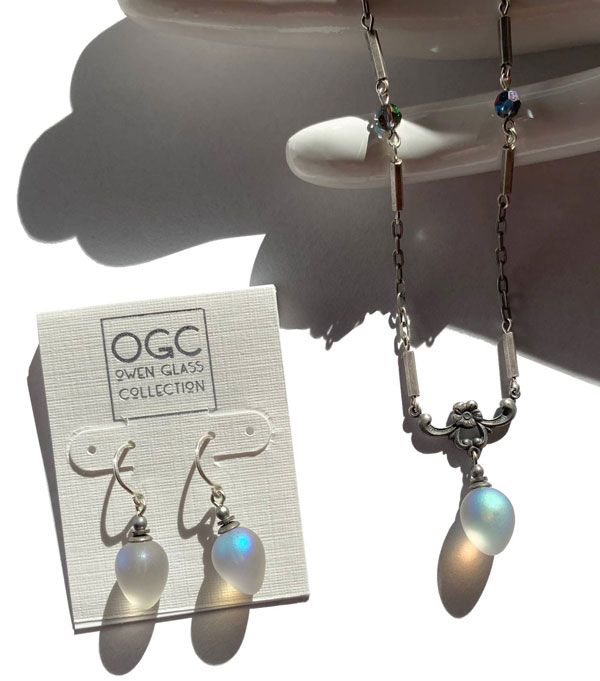 15 inch necklace with 2 inch extender and matching earrings. Mini Berries 10 necklace is antiqued silver overlay, with a light gray iridescent glass drops, designed by Allen Owen and made for us in Germany. Accents are iridescent Austrian crystal. Mini Berries 10 earrings are also pale iridescent gray, with sterling silver ear wires. Mini Berries 10 earrings are 3/4 inches long. All handwork done in the USA.