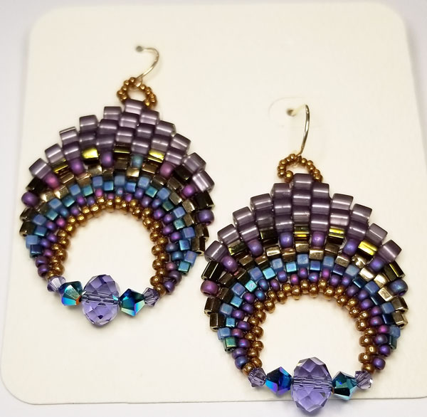 This is one of Wendy’s larger earrings. The purple shades and the night blues are enhanced with the bronze beads. The drop bead of purple surrounded by blue Swarovski crystals offsets the entire earring.
