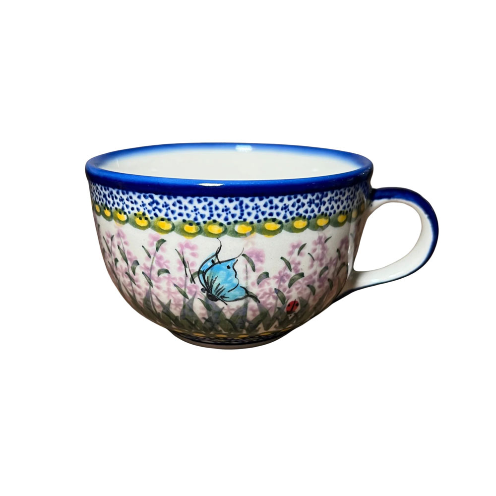 This beautiful over-sized mug is perfect for the coffee drinker who likes quanity. 6×3″. On our mugs, the butterflies are yellow, not blue. The lavender flowers are so delicate, and the ladybugs are a perfect touch.