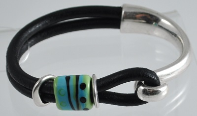 Colorful genuine leather bands joined with non-tarnish metal made with a process using silver and pewter Color coordinated glass bead and metal accents finish the look. Because beads are uniquely made colors and designs may vary slightly from photo.