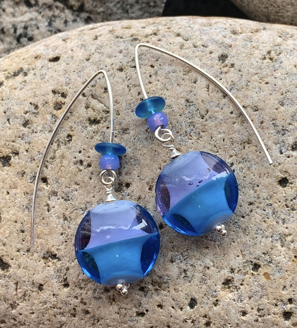 Medium blue/dark lavender two-tone lentil-shaped drops on handmade gold-filled “v” wires with accent beads; approx 2 1/4” top to bottom, 3/4” across. Rubber ear nuts are included for security.