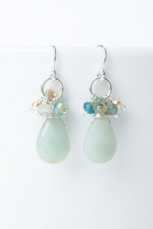 The “milkiness” color of the Amazonite briolette is gorgeous! The cluster of like-colored shades of stones makes this earring captivating. The wire is sterling silver. Length: 1.25″