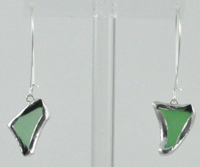 Beach glass earrings with unique, one of a kind shape. Recycled sea glass is surrounded by copper foil & lead-free solder using a stained glass technique. Earrings come on very secure kidney ear wire. Specify small approxm. 1/2″ or medium approxm. 1″. Shown here in: