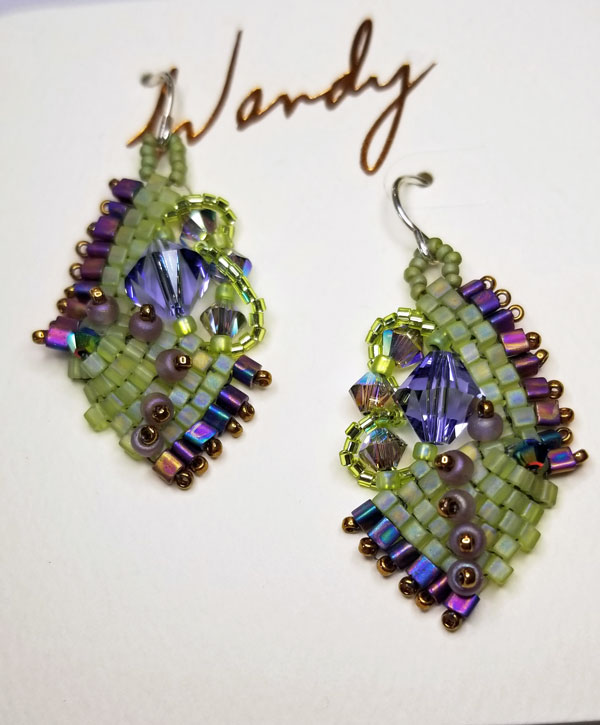 This freeform earring is close to the other lime green, except the colors of purple and lime green are more separated. No 2 freeforms are identical.