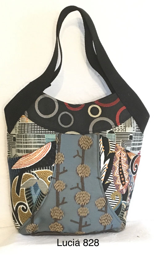 Is it a tote or a purse? You decide! Fits a lap top and several notebooks, or a slew of purse items, this versatile bag boasts a unique shape, two large lined pockets on the outside and 4 pockets on the inside. Made with 4 different fabrics and a beautiful lining. Leather bottom. Shoulder straps are extremely comfortable and light.