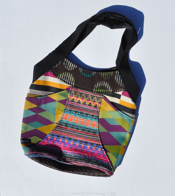 The Lucia – Is it a purse or tote? You decide! Fits a laptop and several notebooks or a slew of purse items. This versatile bag boasts of a unique shape, two large lined pockets on the outside and four pockets on the inside. The dip in fabric is actually a pocket. Made with 4 different fabrics and a beautiful lining. Size from top of shoulder strap to bottom is 21″ tall and 14″ wide.