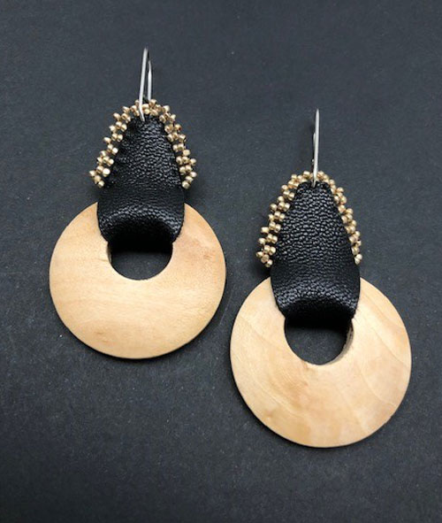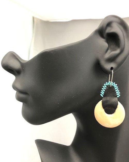 A jump up in size of the wood piece, this is slightly larger and in the light wood color. The colored beads attached to the leather are either turquoise or gold.