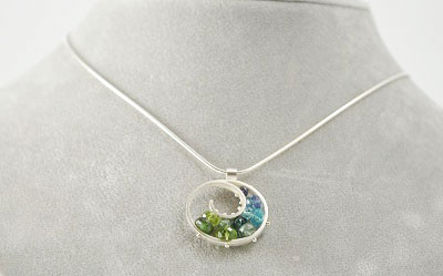 Beautiful geometric circle pendant with Peridot, Apatite, Green Amethyst, and Topaz Iolite inserted. Comes with a Snake Chain. Has matching earrings